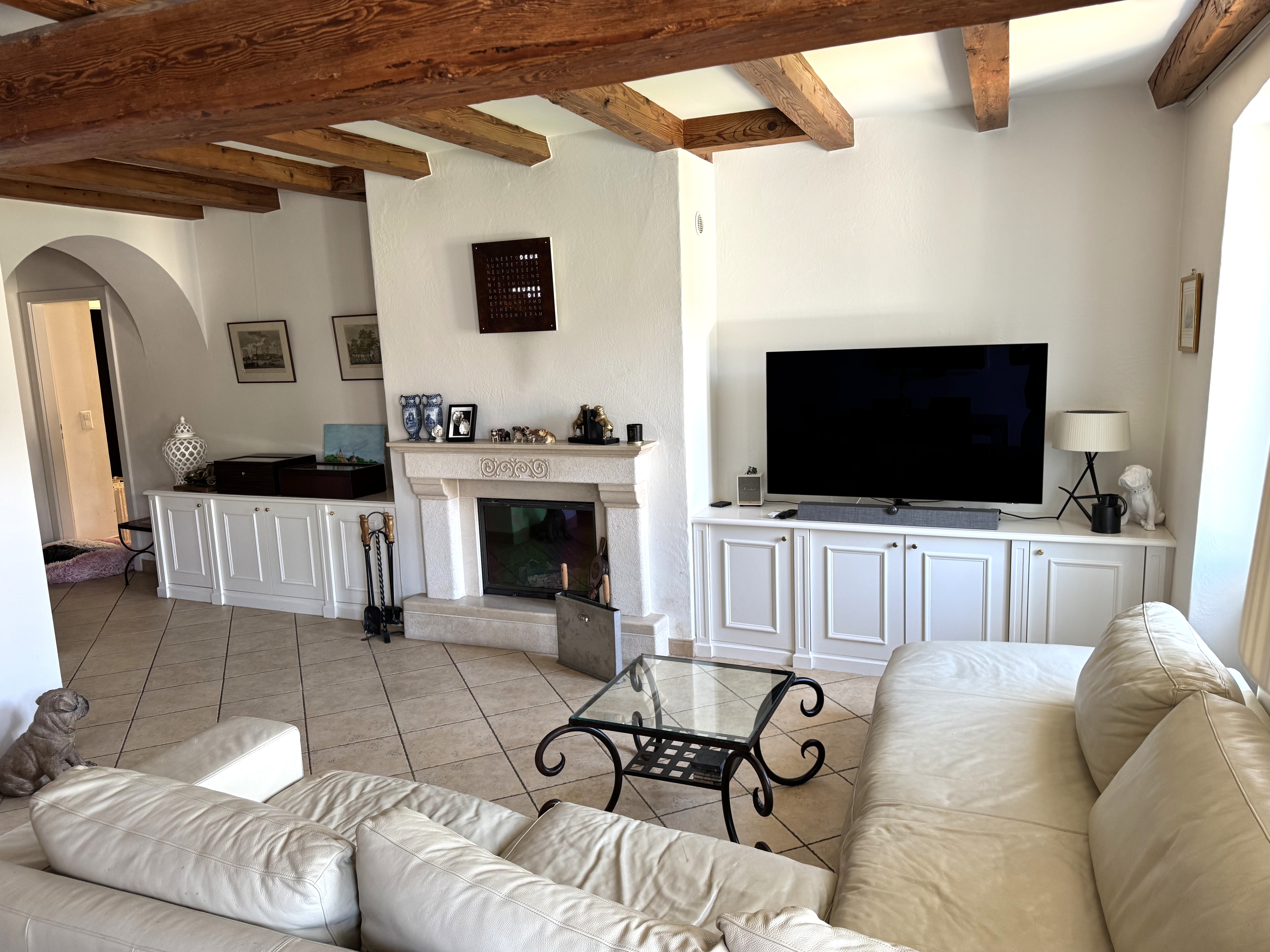 Séjour avec cheminée, coin à manger, accès terrasse et jardin en contrebas (arrosage automatique)