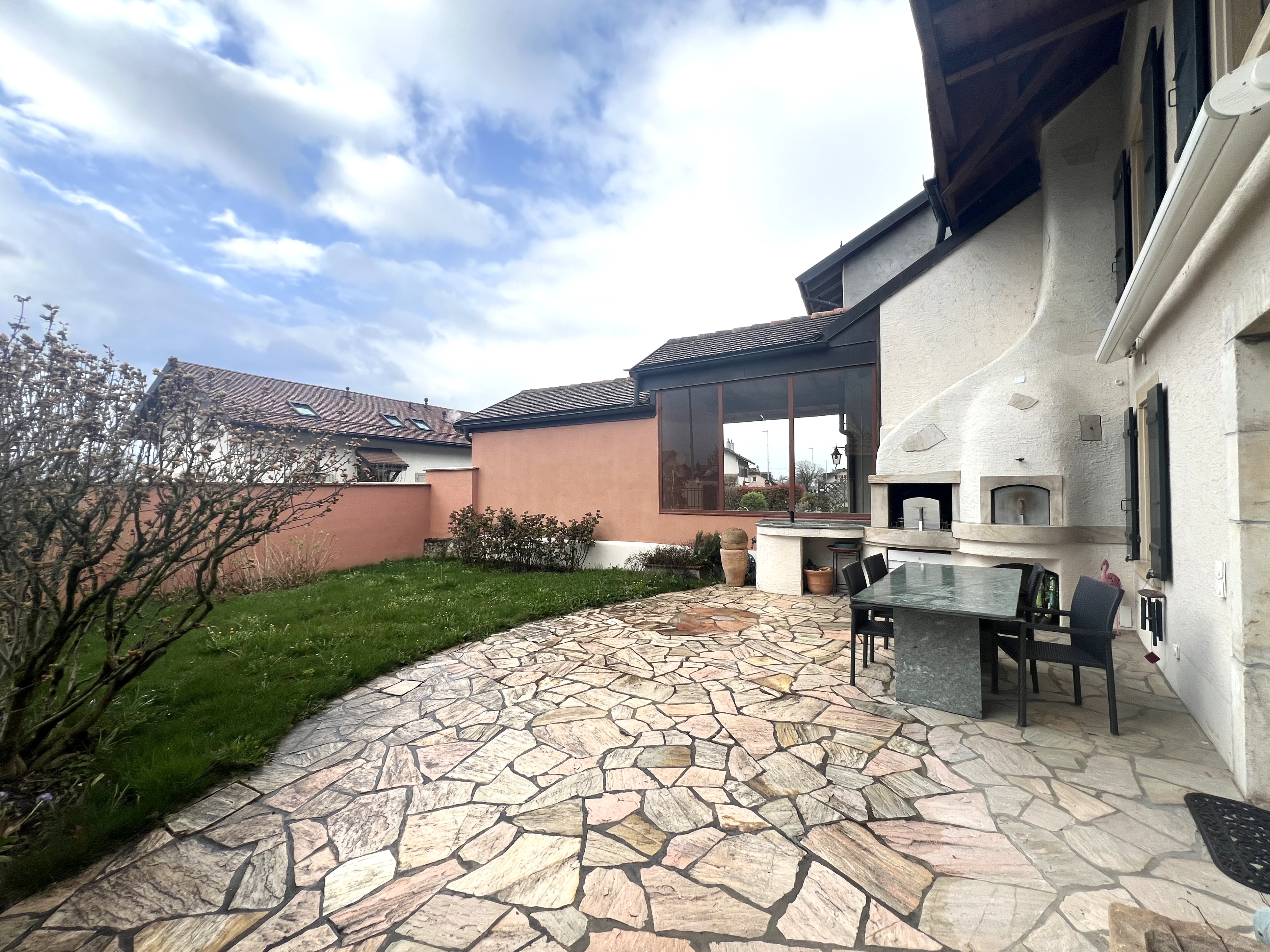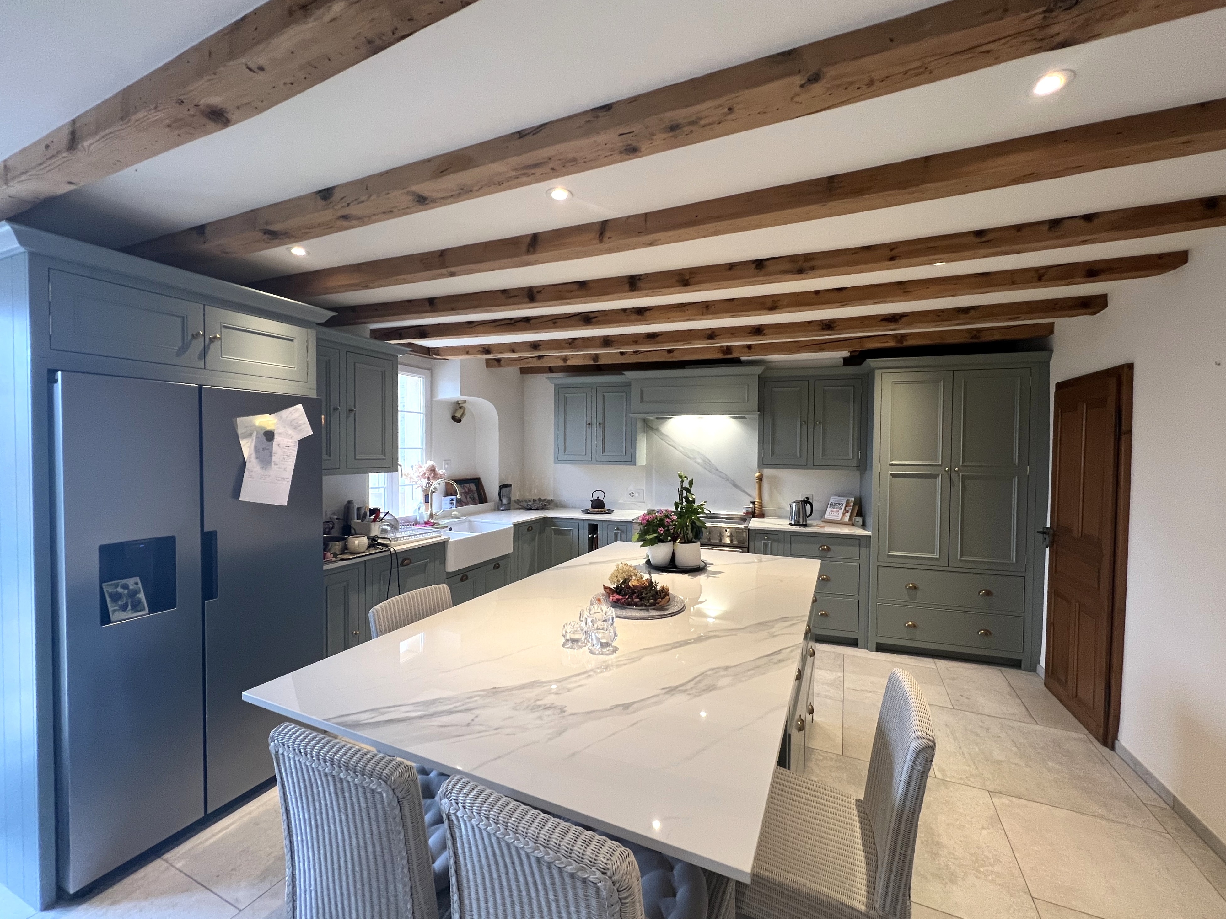 Cuisine fermée habitable avec îlot central, accès terrasse côté lac, avec barbecue et four à pizza