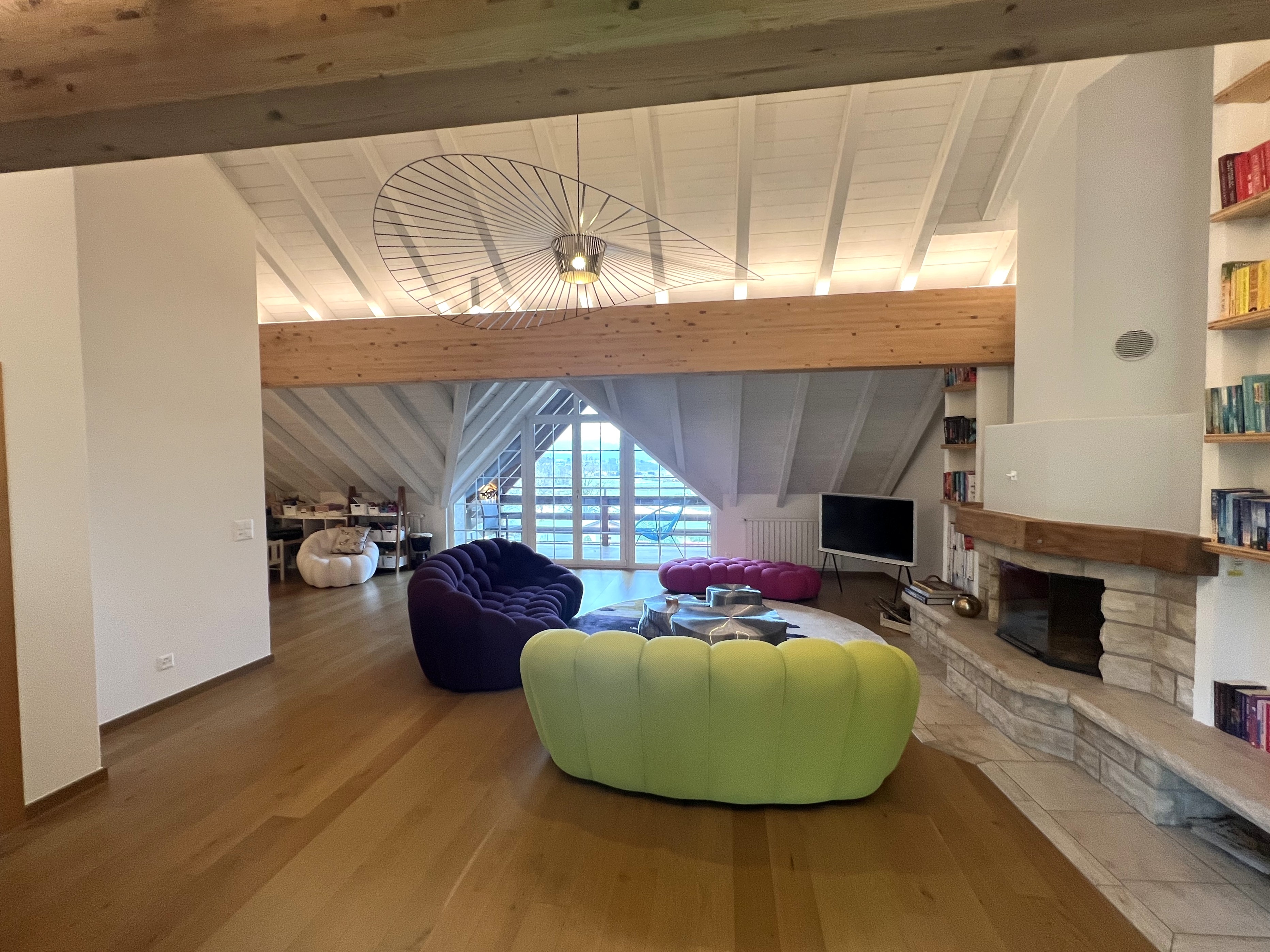 Très grande pièce traversante avec cheminée : espace salon et bureau, kitchenette, accès à un balcon côté lac